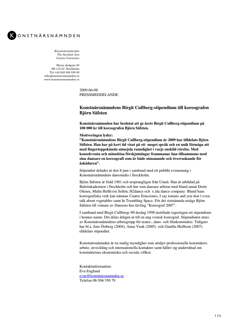 Konstnärsnämndens Birgit Cullberg-stipendium till koreografen Björn Säfsten