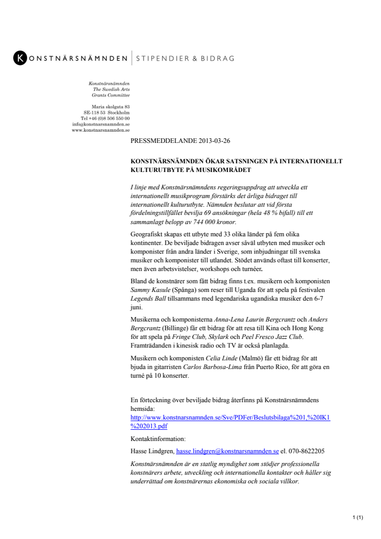 I linje med Konstnärsnämndens regeringsuppdrag att utveckla ett internationellt musikprogram förstärks det årliga bidraget till internationellt kulturutbyte. Nämnden beslutar att vid första fördelningstillfället bevilja 69 ansökningar (hela 48 % bifall) till ett sammanlagt belopp av 744 000 kronor.