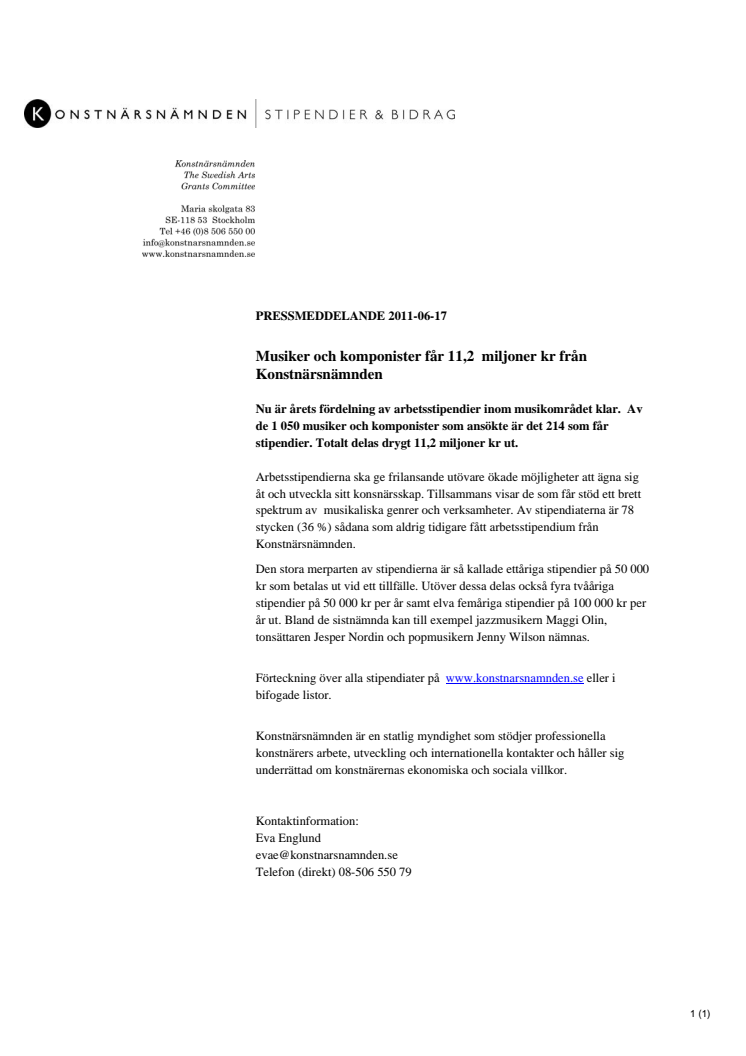 Nu är årets fördelning av arbetsstipendier inom musikområdet klar. Av de 1 050 musiker och komponister som ansökte är det 214 som får stipendier. Totalt delas drygt 11,2 miljoner kr ut.