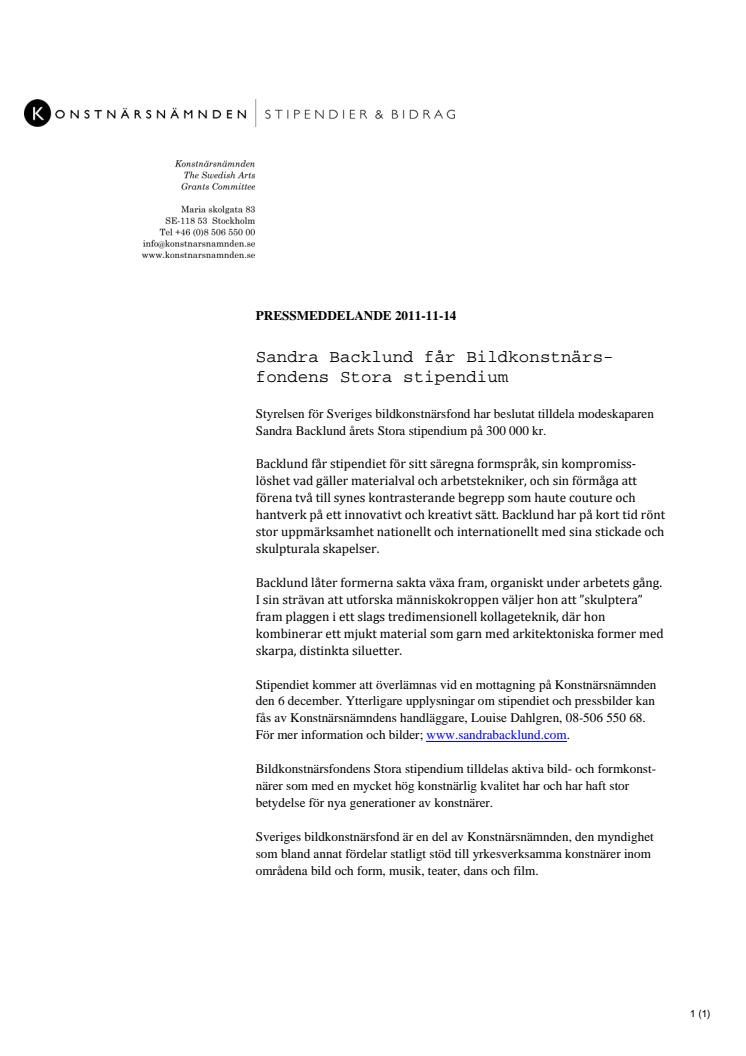 Styrelsen för Sveriges bildkonstnärsfond har beslutat tilldela modeskaparen
