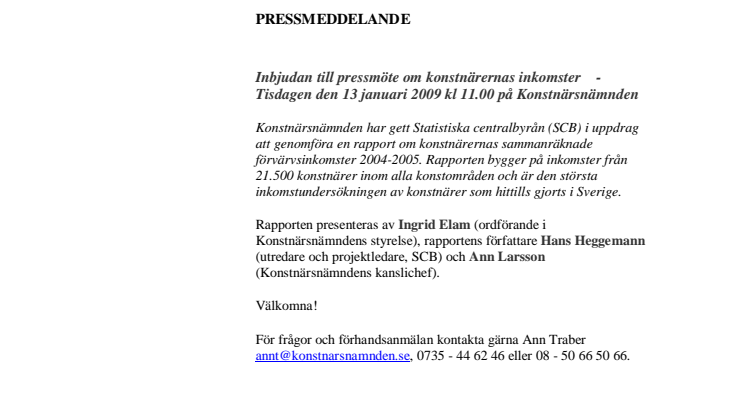 • Inbjudan till pressmöte om inkomstundersökning av konstnärer 2004-2005