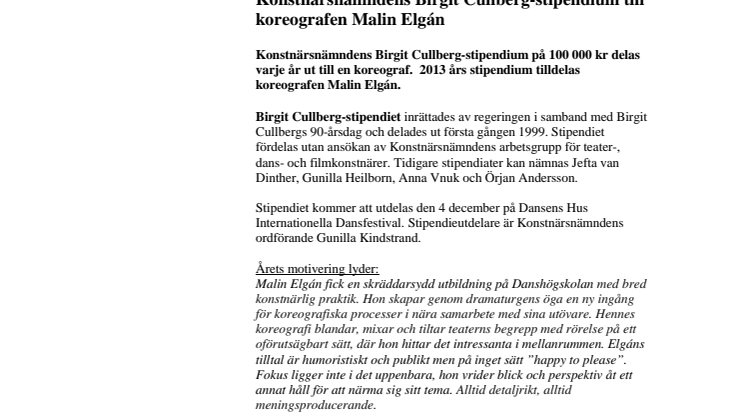 • Konstnärsnämndens Birgit Cullberg-stipendium till koreografen Malin Elgán
