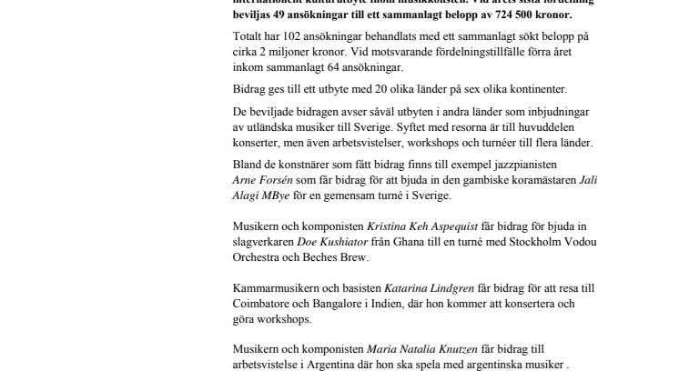 • Internationella kulturutbytesbidrag utdelade på musikområdet