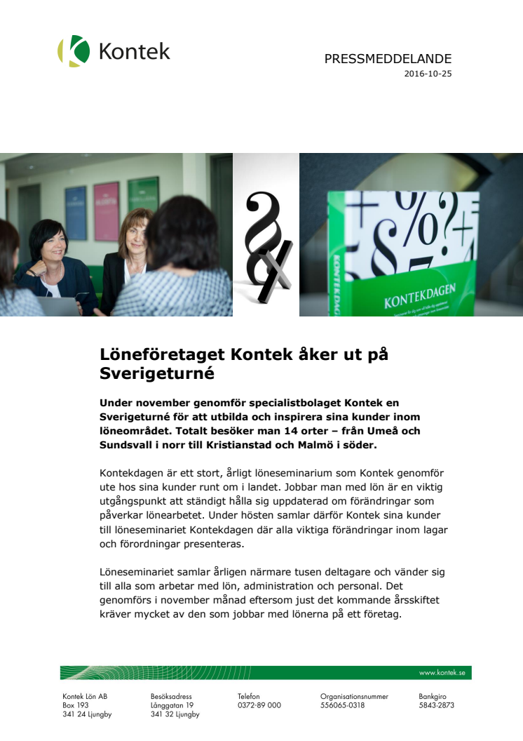 Under november genomför specialistbolaget Kontek en Sverigeturné för att utbilda och inspirera sina kunder inom löneområdet. Totalt besöker man 14 orter – från Umeå och Sundsvall i norr till Kristianstad och Malmö i söder.