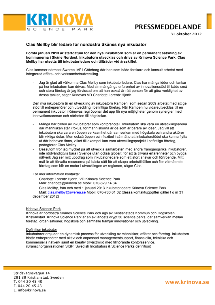 Första januari 2013 är startdatum för den nya inkubatorn som är en permanent satsning av kommunerna i Skåne Nordost. Inkubatorn utvecklas och drivs av Krinova Science Park. Clas Mellby har utsetts till inkubatorledare och tillträder vid årsskiftet.