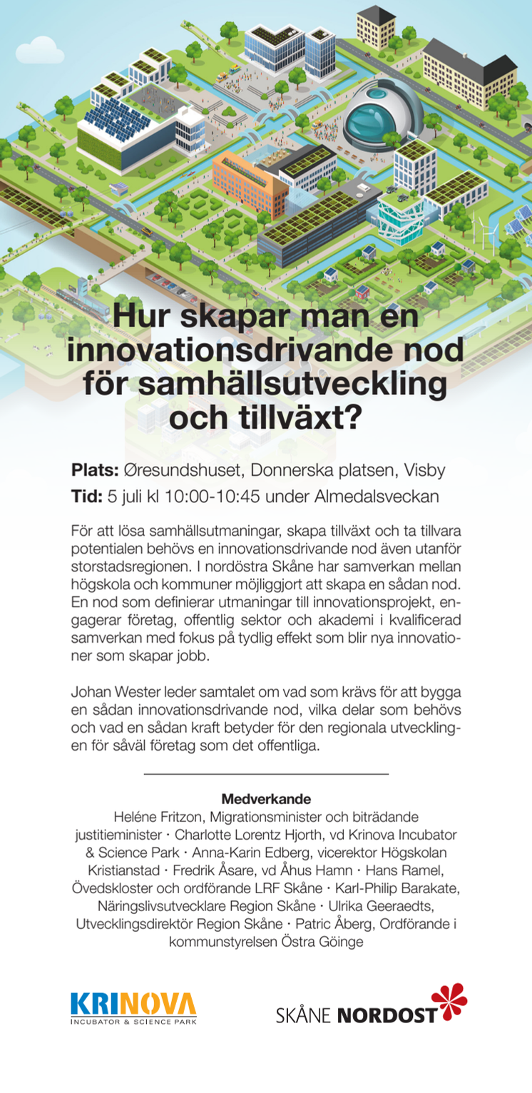 Almedalsveckan närmar sig. Tillsammans med Skåne Nordost bjuder Krinova in till seminariet: "Hur skapar man en innovationsdrivande nod för samhällsutveckling och tillväxt?" För att lösa samhällsutmaningar och skapa tillväxt krävs mod, innovationer och duktiga företagare. Men också stödjande funktioner runtomkring företagen oavsett var i Sverige man verkar.