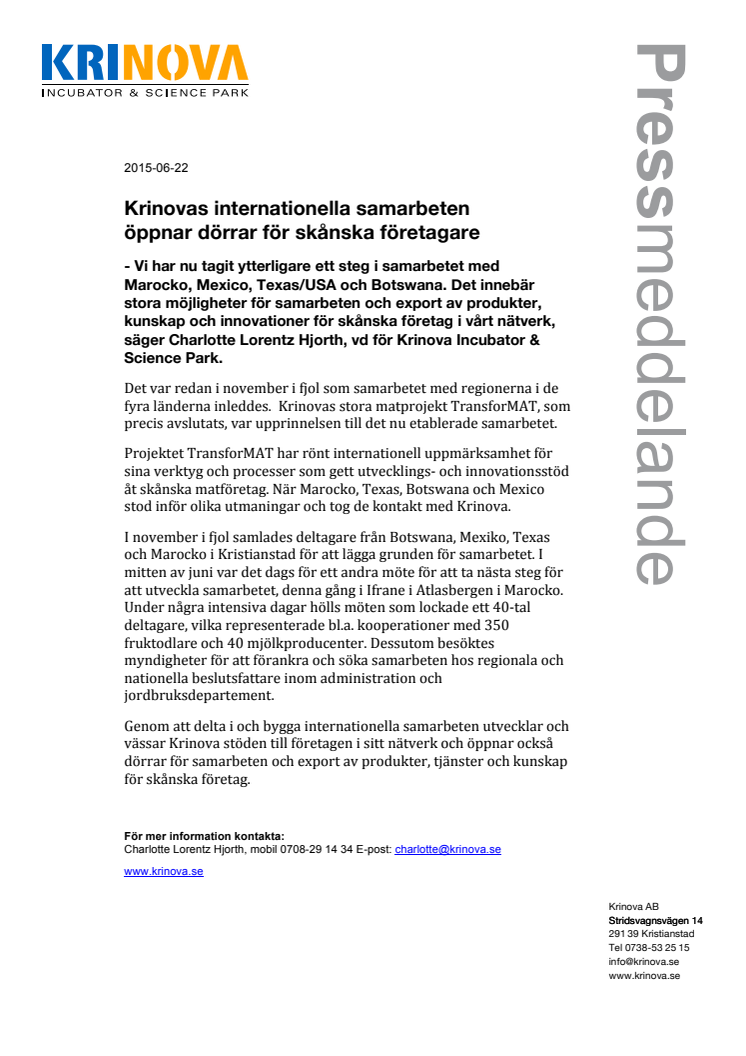 - Vi har nu tagit ytterligare ett steg i samarbetet med Marocko, Mexico, Texas/USA och Botswana. Det innebär stora möjligheter för samarbeten och export av produkter, kunskap och innovationer för skånska företag i vårt nätverk, säger Charlotte Lorentz Hjorth, vd för Krinova Incubator & Science Park.