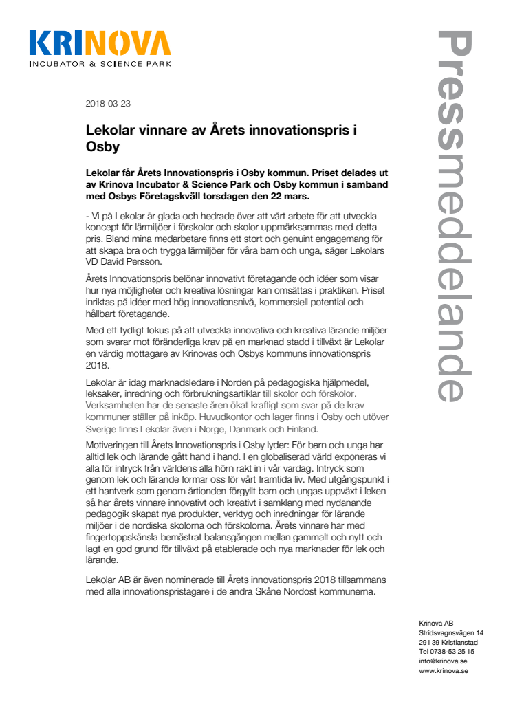 Lekolar får Årets Innovationspris i Osby kommun. Priset delades ut av Krinova Incubator & Science Park och Osby kommun i samband med Osbys Företagskväll torsdagen den 22 mars.