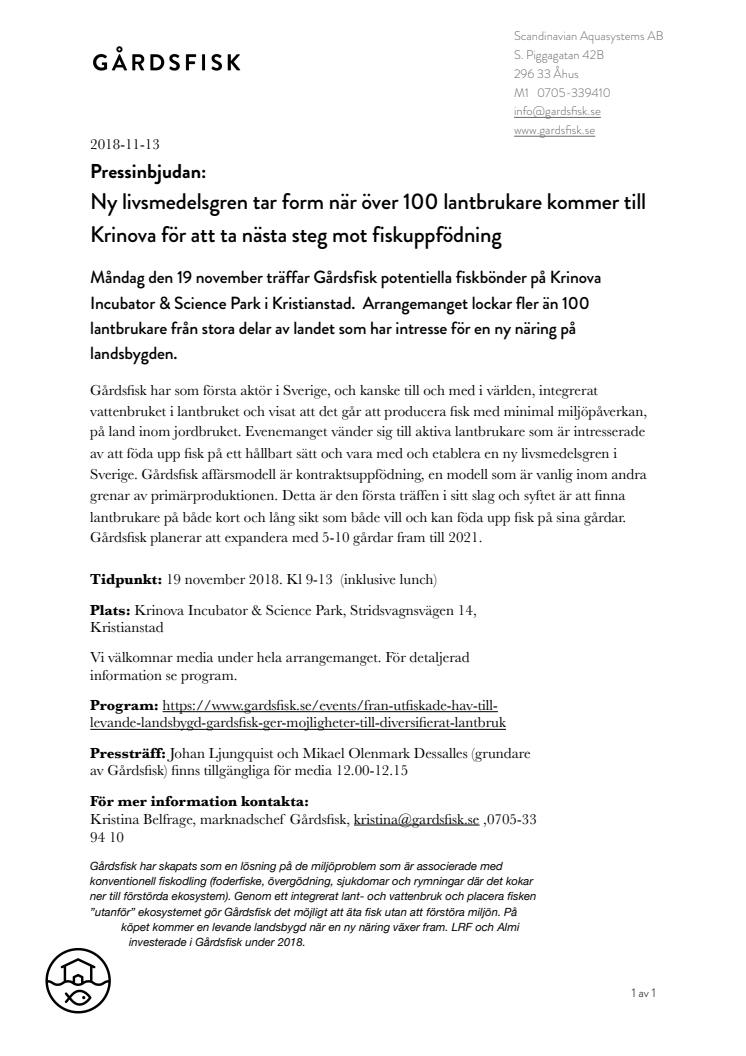 Pressinbjudan: Ny livsmedelsgren tar form när över 100 lantbrukare kommer till Krinova för att ta nästa steg mot fiskuppfödning