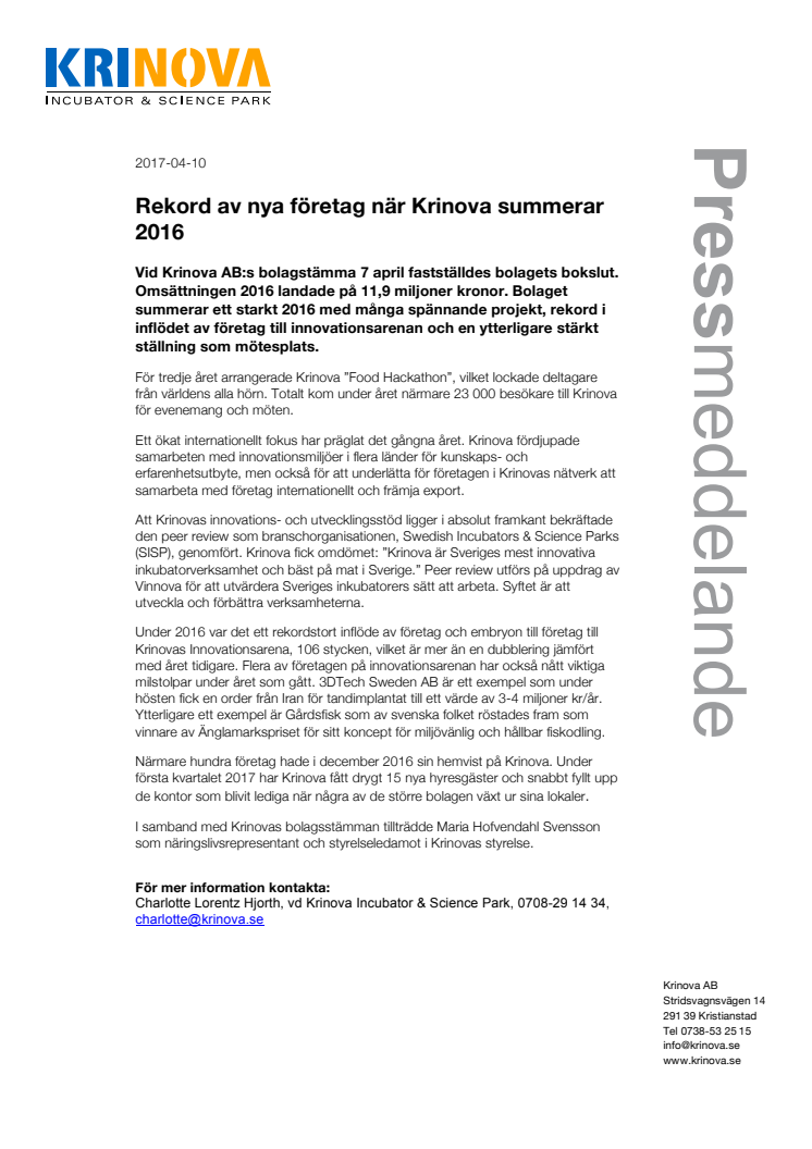 Vid Krinova AB:s bolagstämma 7 april fastställdes bolagets bokslut. Omsättningen 2016 landade på 11,9 miljoner kronor. Bolaget summerar ett starkt 2016 med många spännande projekt, rekord i inflödet av företag till innovationsarenan och en ytterligare stärkt ställning som mötesplats.