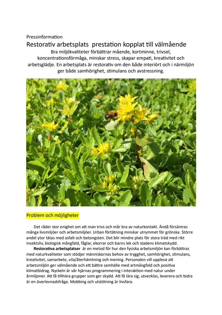 Bra miljökvaliteter förbättrar mående, kortminne, trivsel, koncentrationsförmåga, minskar stress, skapar empati, kreativitet och arbetsglädje. En arbetsplats är restorativ om den både interiört och i närmiljön ger både samhörighet, stimulans och avstressning.
