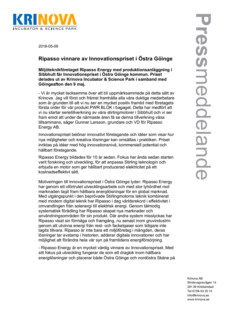 Miljöteknikföretaget Ripasso Energy med produktionsanläggning i Sibbhult får Innovationspriset i Östra Göinge kommun. Priset delades ut av Krinova Incubator & Science Park i samband med Göingeafton den 9 maj.
