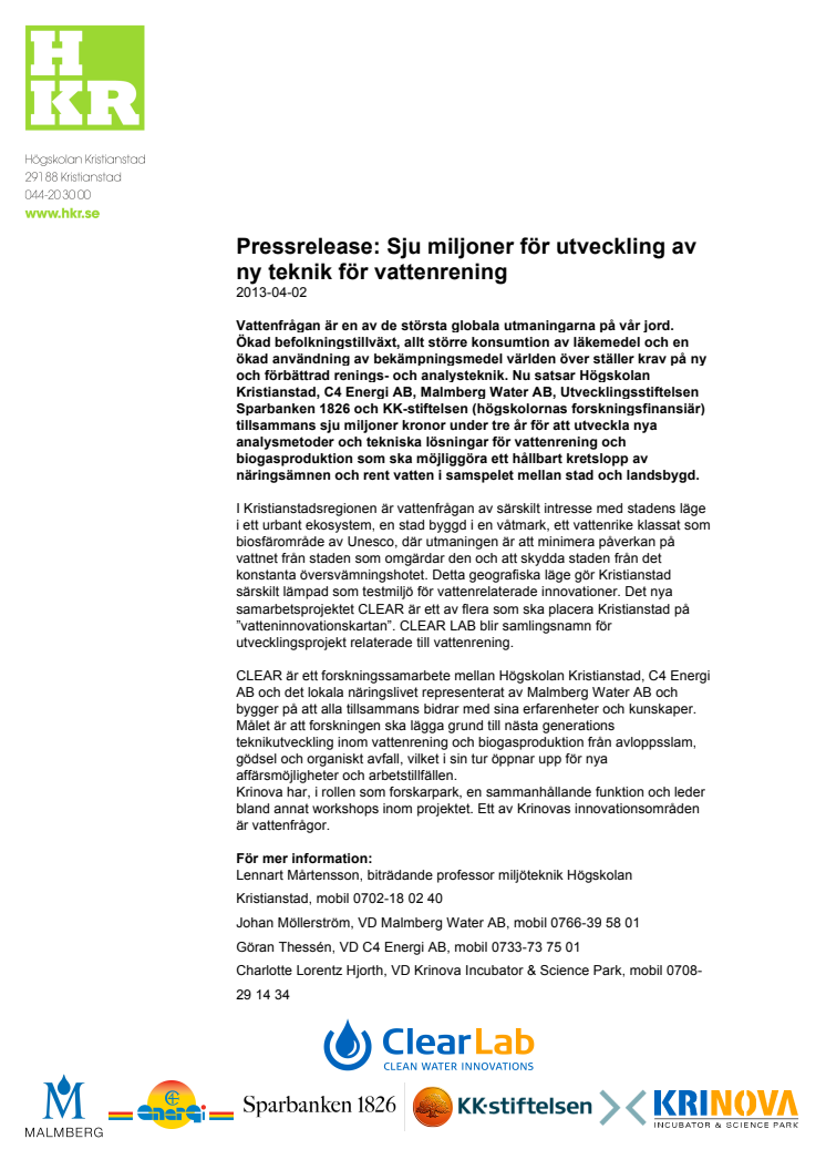 Högskolan Kristianstad, C4 Energi AB, Malmberg Water AB, Utvecklingsstiftelsen Sparbanken 1826 och KK-stiftelsen satsar tillsammans sju miljoner kronor under tre år för att utveckla nya analysmetoder och tekniska lösningar för vattenrening och biogasproduktion som ska möjliggöra ett hållbart kretslopp av näringsämnen och rent vatten i samspelet mellan stad och landsbygd.