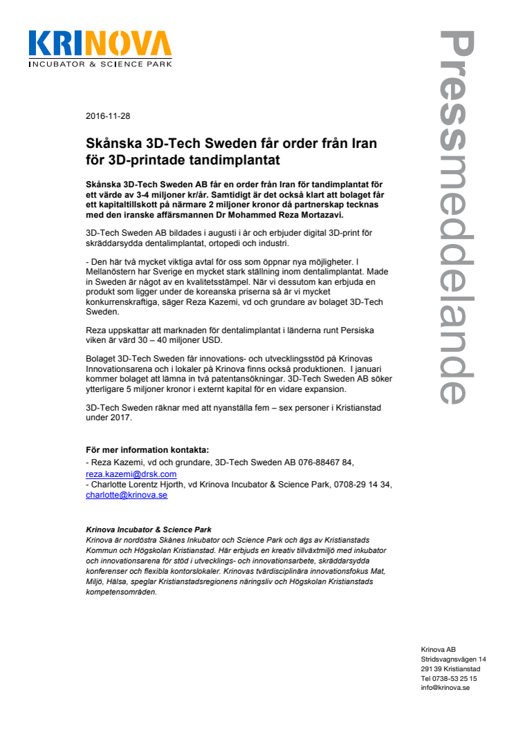 Skånska 3D-Tech Sweden AB får en order från Iran för tandimplantat för ett värde av 3-4 miljoner kr/år. Samtidigt är det också klart att bolaget får ett kapitaltillskott på närmare 2 miljoner kronor då partnerskap tecknas med den iranske affärsmannen Dr Mohammed Reza Mortazavi.