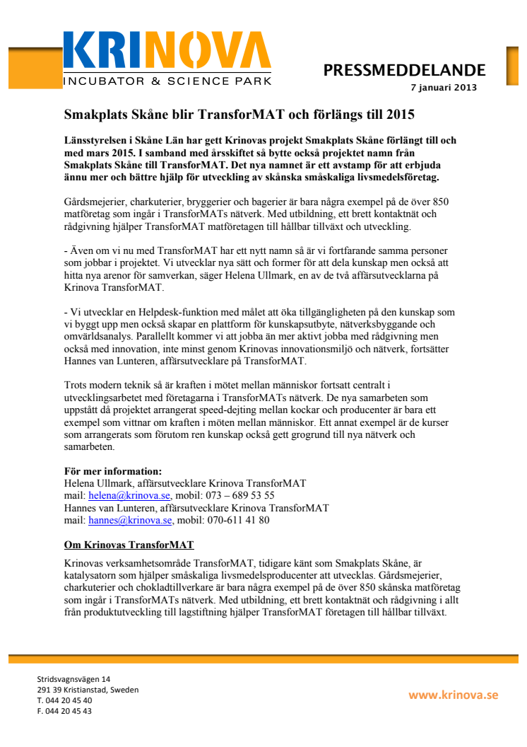 Länsstyrelsen i Skåne Län har gett Krinovas projekt Smakplats Skåne förlängt till och med mars 2015. I samband med årsskiftet så bytte också projektet namn från Smakplats Skåne till TransforMAT. Det nya namnet är ett avstamp för att erbjuda ännu mer och bättre hjälp för utveckling av skånska småskaliga livsmedelsföretag.