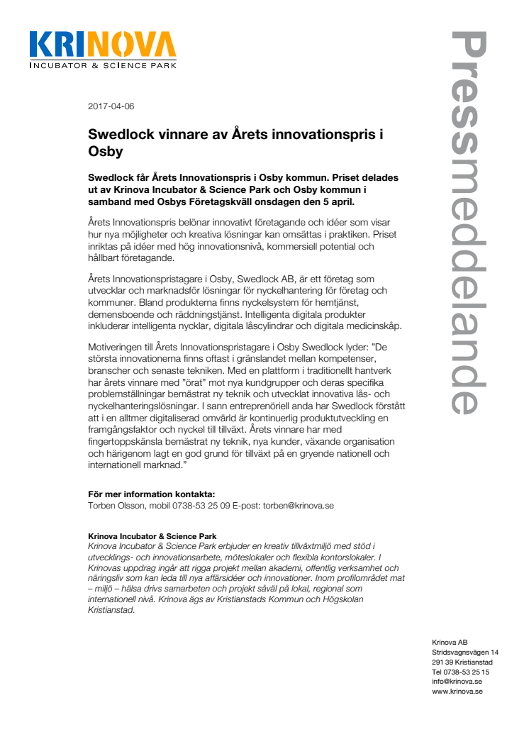 Swedlock får Årets Innovationspris i Osby kommun. Priset delades ut av Krinova Incubator & Science Park och Osby kommun i samband med Osbys Företagskväll onsdagen den 5 april.