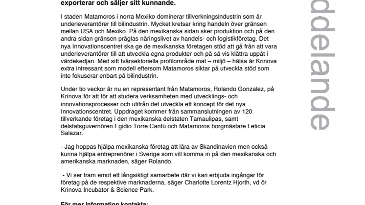 I staden Matamoros i norra Mexiko dominerar tillverkningsindustrin som är underleverantörer till bilindustrin. Mycket kretsar kring handeln över gränsen mellan USA och Mexiko. På den mexikanska sidan sker produktion och på den andra sidan gränsen präglas näringslivet av handels- och logistikföretag. Det nya Innovationscentret ska ge de mexikanska företagen stöd att gå från att vara underleverantörer till att utveckla egna produkter och på så vis klättra uppåt i värdekedjan. Med sitt tvärsektoriella profilområde mat – miljö – hälsa är Krinova extra intressant som modell eftersom Matamoros siktar på utveckla stöd som inte fokuserar enbart på bilindustrin.