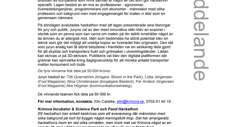 På söndagen avslutades hackathon på Krinova med att lagen presenterade sina lösningar för jury och publik. Juryns val av den mest innovativa idén blev en scanner i storlek som en penna som kan varna om maten på din tallrik innehåller något av de ämnen du är allergisk mot. Idén som bedömdes ha störst potential blev en teknik som gör det möjligt att urskilja kopior av livsmedel från originalen. Den idé som juryn ansåg kan få störst betydelse i framtiden var en sexkantig låda gjord för att skydda och transportera frukt och grönsaker i utvecklingsländer. Lådan kan skrivas ut på 3D-skrivare. Publikens val blev den digitala plattformen där grannar kan samverka kring dagligvaruinköp för att minska antalet transporter mellan konsument och butik.