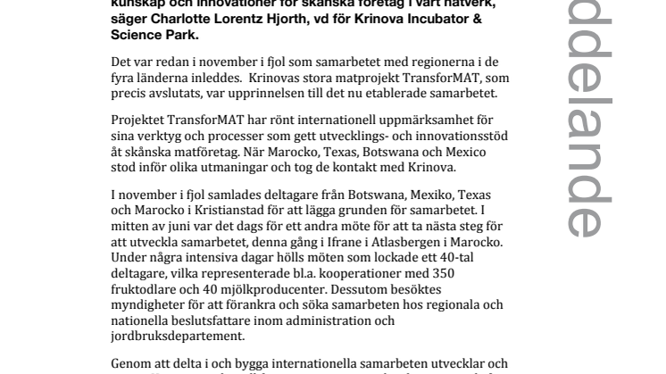 Projektet TransforMAT har rönt internationell uppmärksamhet för sina verktyg och processer som gett utvecklings- och innovationsstöd åt skånska matföretag. När Marocko, Texas, Botswana och Mexico stod inför olika utmaningar tog de kontakt med Krinova. Marocko har många småskaliga livsmedelsprimärproducenter som vill ta nästa steg i förädlingskedjan. Departementen i Botswana vill få igång småskalig livsmedelsproduktion. I Mexico är det ett kluster av underleverantörer till bilindustrin som vill få igång diversifiering av industrin. Texas vill också utveckla småskalig hållbar livsmedelsproduktion.