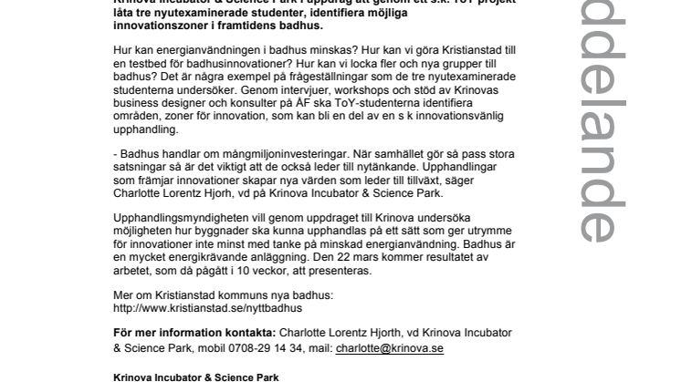 Upphandlingsmyndigheten vill genom uppdraget till Krinova undersöka möjligheten hur byggnader ska kunna upphandlas på ett sätt som ger utrymme för innovationer inte minst med tanke på minskad energianvändning. Badhus är en mycket energikrävande anläggning. Den 22 mars kommer resultatet av arbetet, som då pågått i 10 veckor, att presenteras.