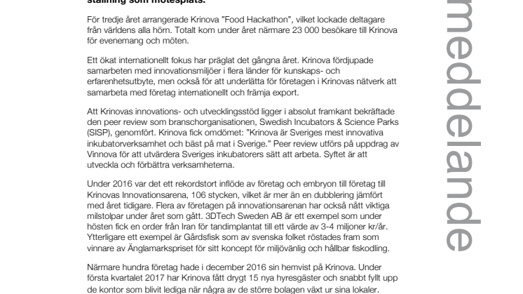 För tredje året arrangerade Krinova ”Food Hackathon”, vilket lockade deltagare från världens alla hörn. Totalt kom under året närmare 23 000 besökare till Krinova för evenemang och möten.