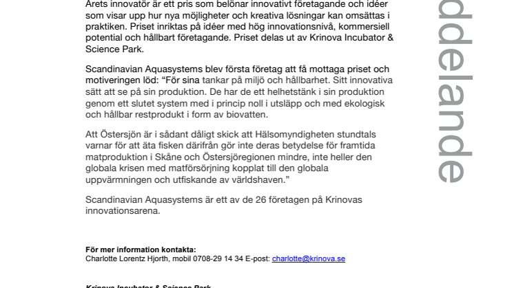 Scandinavian Aquasystems blev årets innovatör i samband med Kristianstads Guldjubelgala på torsdagskvällen den 16 april. Det nyinstiftade priset, Årets innovatör, delas ut av Krinova Incubator & Science Park.