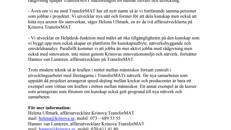 - Även om vi nu med TransforMAT har ett nytt namn så är vi fortfarande samma personer som jobbar i projektet. Vi utvecklar nya sätt och former för att dela kunskap men också att hitta nya arenor för samverkan, säger Helena Ullmark, en av de två affärsutvecklarna på Krinova TransforMAT.