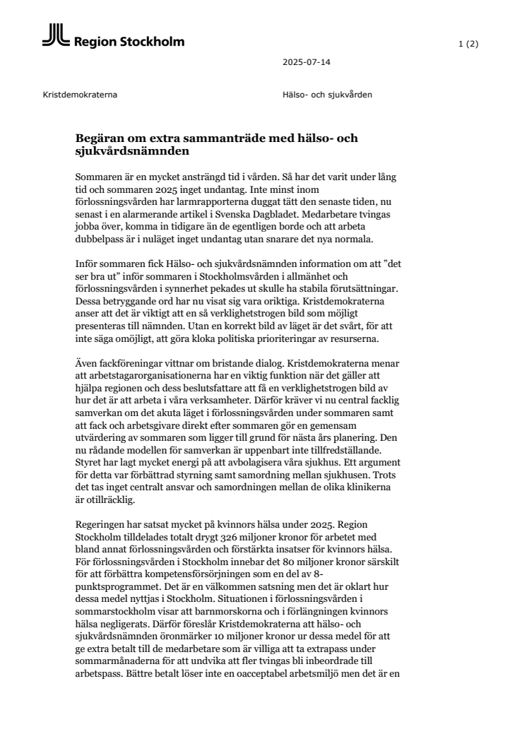Begäran om extra sammanträde med hälso- och sjukvårdsnämnden