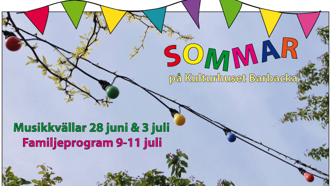 Sommar på Kulturhuset Barbacka betyder utomhusverksamhet, eget skapande, prova-på aktiviteter, uppvisningar, musikkvällar och trädgårdspyssel! I sommar arrangerar vi två musikkvällar på vår mysiga innergård! Tre dagar i juli bjuder vi på familjeaktiviteten "Trädgårdspyssel" med krukor, vindspel och vindsnurror!