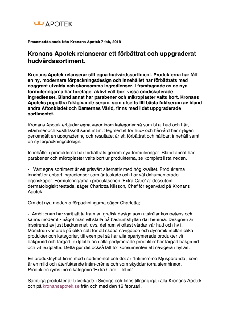 Kronans Apoteks populära fuktgivande serum, som utsetts till bästa fuktserum av bland andra Aftonbladet och Damernas Värld, finns med i det uppgraderade sortimentet.