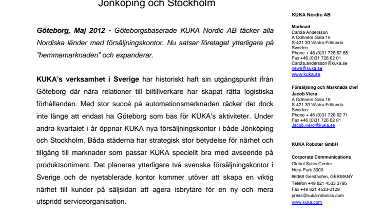 KUKA’s verksamhet i Sverige har historiskt haft sin utgångspunkt ifrån Göteborg där nära relationer till biltillverkare har skapat rätta logistiska förhållanden. Med stor succé på automationsmarknaden räcker det dock inte länge att endast ha Göteborg som bas för KUKA’s aktiviteter. Under andra kvartalet i år öppnar KUKA nya försäljningskontor i både Jönköping och Stockholm. Båda städerna har strategisk stor betydelse för närhet och tillgång till marknader som passar KUKA speciellt bra med avseende på produktsortiment. Det planeras ytterligare två svenska försäljningskontor i Sverige och de nyetablerade kontor kommer utöver att skapa en viktig närhet till kunder på säljsidan att agera isbrytare för en ny och mera utspridd serviceorganisation.