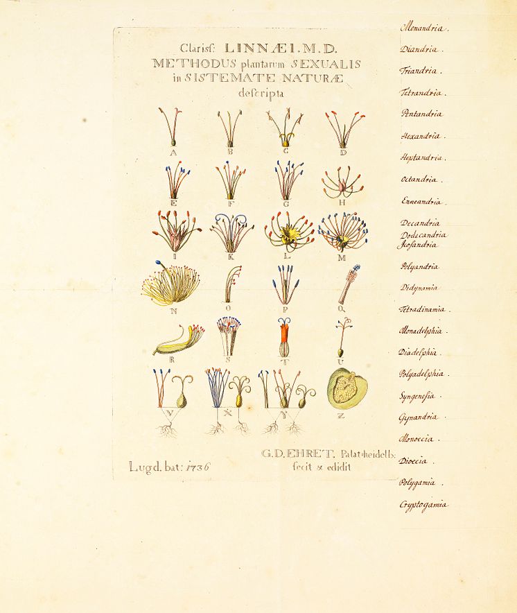 Georg Ehrets illustration av Linnés schema över växtrikets tjugofyra klasser, Uppsala universitetsbibliotek.