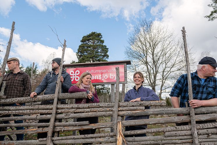 Personalen på plats vid nya skylten. Fr v Adam Nilsson, Mathias Börjesson, Liselott Källström, Länsstyrelsen i Kalmar, Frida Persson och Hans Nilsson.
