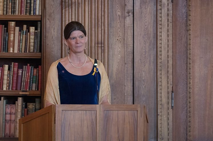 Sofia Hoas, ordförande i Föreningen Svenskbyborna, framför föreningens tack. Föreningen är mottagare av Bernadottepriset 2023.
