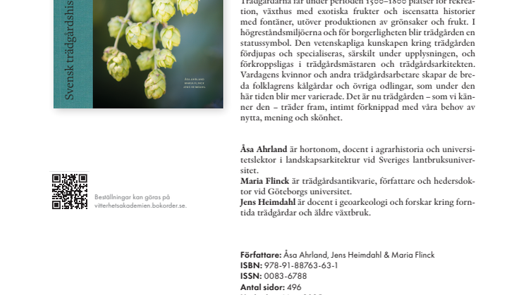 Med Svensk trädgårdshistoria. 1500 till 1800 (2025) är trebandsverket Svensk trädgårdshistoria, som behandlar svensk trädgårdsodling från förhistorien och in i vår tid, komplett. De två andra delarna är Svensk trädgårdshistoria. Förhistoria och medeltid (2021) och Svensk trädgårdshistoria. 1800- och 1900-tal (2023).