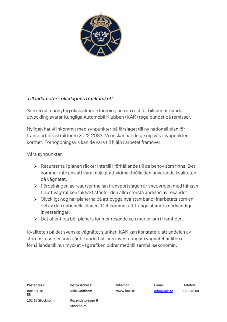 KAK har skickat en skrivelse om nationell plan för infrastrukturen till riksdagens trafikutskott.