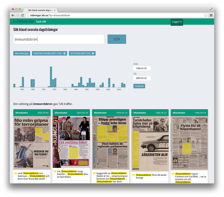 KB lanserar nu en beta-version av tjänsten. I den versionen finns hela Aftonbladets och Svenska dagbladets utgivning, från mitten av 1800-talet fram till i dag.
