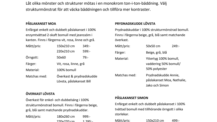 Säsongens mjuka produkter har gjort entré i våra butiker och på kungsangen.com. Ge ditt hem lite extra kärlek med produkter som bäddlinnen, prydnadskuddar, plädar och överkast. Säsongens produkter presenteras i fem teman: • Fågelkvitter och romantisk natur • Mönstermixa • Nyanser av blått • Harmoniskt enfärgat och ton-i-ton • Lyxig sammet och len pälsimitation