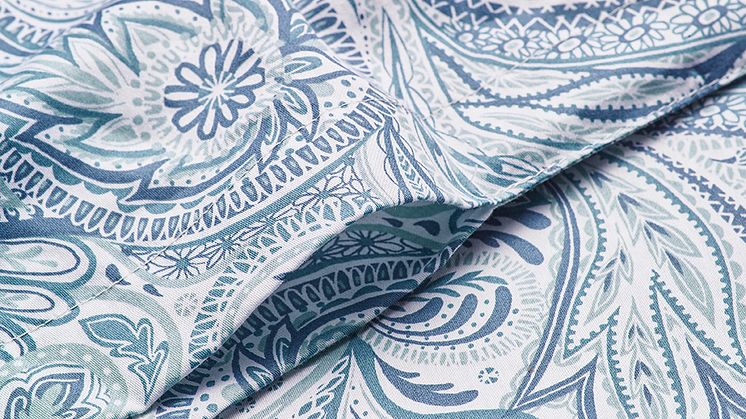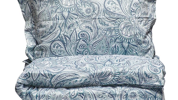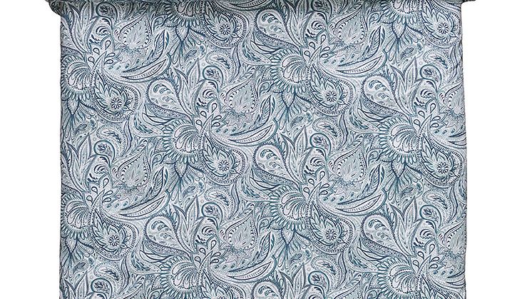 Paisleymönstrat påslakanset i gröna nyanser.