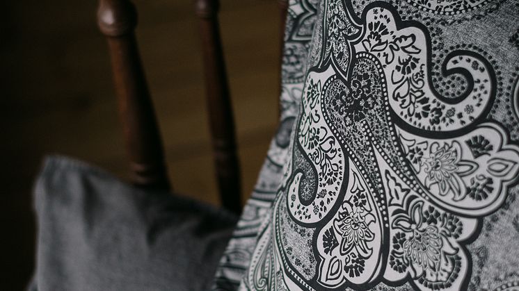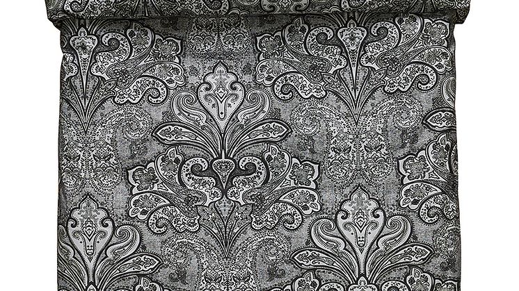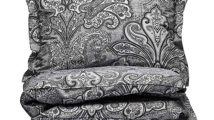 Paisleymönstrat påslakanset i gråa nyanser.
