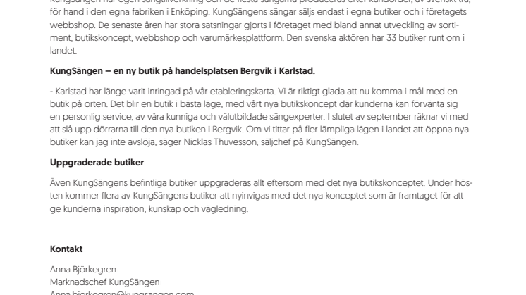 - Karlstad har länge varit inringad på vår etableringskarta. Vi är riktigt glada att nu komma i mål med en butik på orten. Det blir en butik i bästa läge, med vårt nya butikskoncept där kunderna kan förvänta sig en personlig service, av våra kunniga och välutbildade sängexperter. I slutet av september räknar vi med att slå upp dörrarna till den nya butiken i Bergvik. Om vi tittar på fler lämpliga lägen i landet att öppna nya butiker kan jag inte avslöja, säger Nicklas Thuvesson, säljchef på KungSängen.