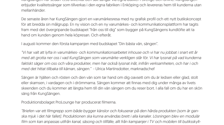 ”Vi har valt att lyfta in varumärkes- och kommunikationsarbetet inhouse och vi har nu jobbat i snart ett år med att grotta ner oss i vad KungSängen som varumärke verkligen står för. Vi har lyssnat på vad kunderna faktiskt säger om oss och våra produkter, men har också lyssnat inåt, inifrån verksamheten, och har i och med det hittat tillbaka till kärnan, sängen.” - Ulrica Martinsdotter, marknadschef
