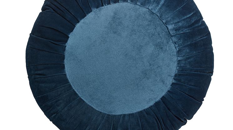 Rund prydnadskudde i sammet med dekorativ knapp i korall och petrol.