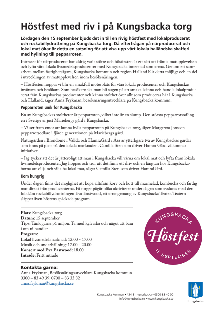 Lördagen den 15 september bjuds det in till en rivig höstfest med lokalproducerat och rockabillydrottning på Kungsbacka torg. Då efterfrågan på närproducerat och lokal mat ökar är detta en satsning för att visa upp vårt lokala halländska skafferi med hyllning till pepparroten.