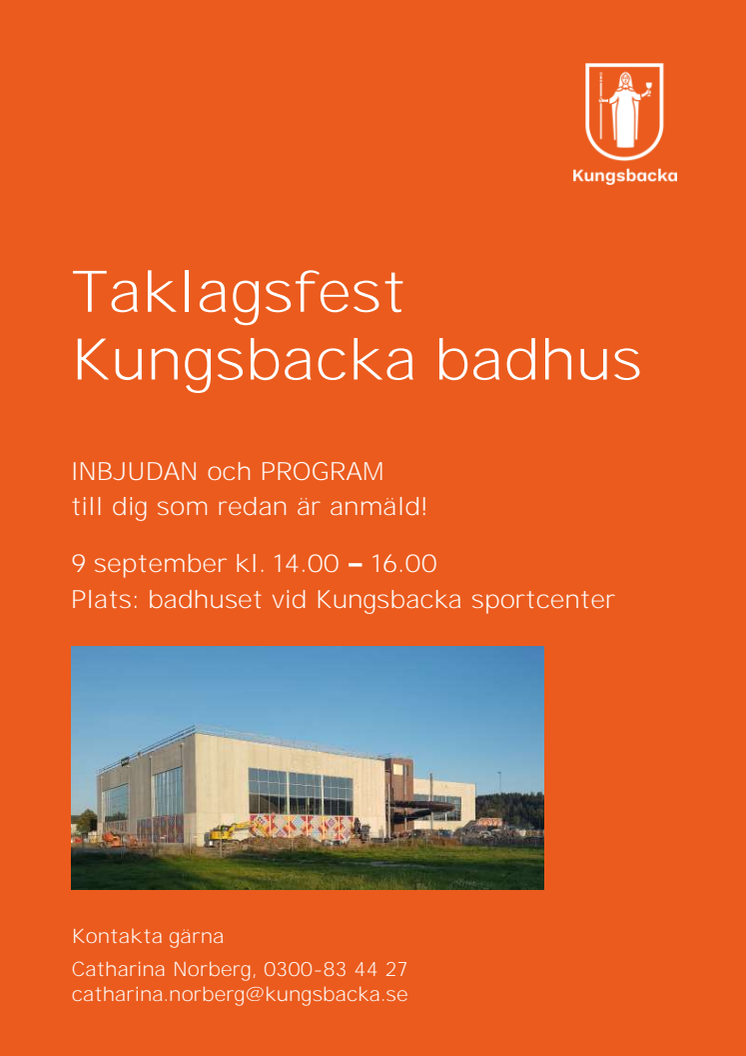 Måndagen den 9 september hålls taklagsfest i Kungsbacka badhus för personal från totalentreprenören Betonmast, inbjudna gäster, representanter från kommun och politik samt media. Byggnationen av badhuset är ett samverkansprojekt med totalentreprenören Betonmast.