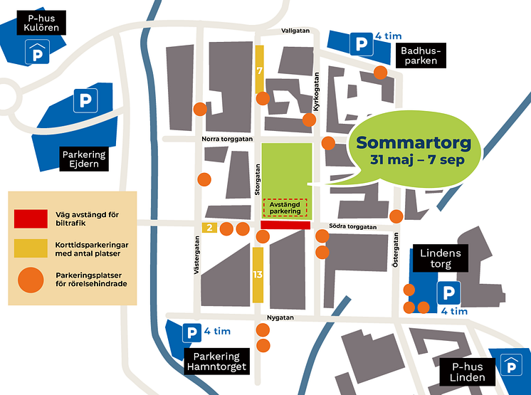 Karta över sommartorget, och parkeringsplatser och trafikpåverkan.