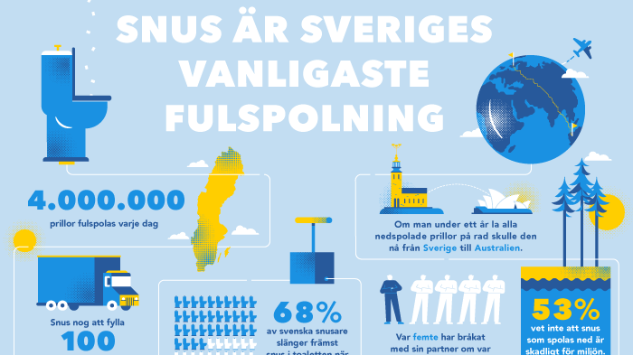 Svenskt vatten har nyligen gjort en undersökning för att ta reda på varför så många slänger snus i toaletten. I Kungsbacka kommun spolas det varje dag ner 30500 snusprillor i toaletten, vilket i sin tur blir till 11,1 miljoner snusprillor per år.