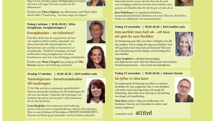 Under hösten erbjuder vi precis som tidigare år kostnadsfria föräldraföreläsningar inom ramen för Föräldrar emellan. Vi kan nu presentera höstens program med sju föreläsningar om olika aktuella ämnen.