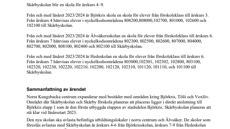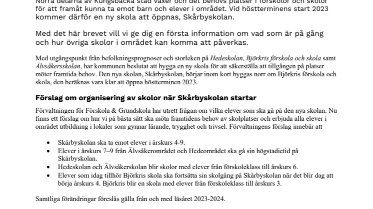 När Kungsbacka växer med fler bostäder behöver det skapas platser i förskolor och grundskolor till de nya invånarna. En ny skola, Skårbyskolan, börjar därför snart byggas i området Björkris. Skårbyskolan ska vara klar vid höstterminens start 2023. Nu finns ett förslag om vilka elever som ska gå på den nya skolan. Förslaget innebär att befintliga skolor i området får ny organisation.