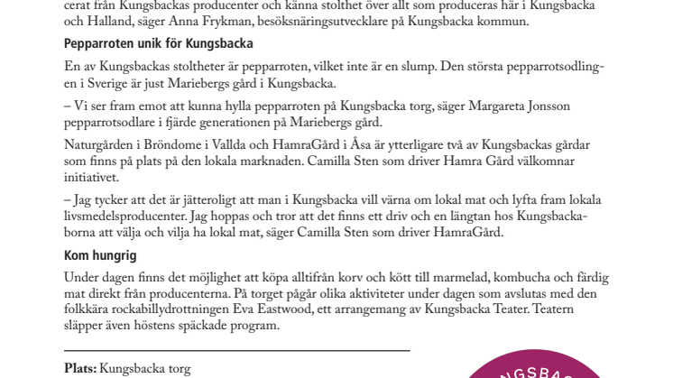 Lördagen den 15 september bjuds det in till en rivig höstfest med lokalproducerat och rockabillydrottning på Kungsbacka torg. Då efterfrågan på närproducerat och lokal mat ökar är detta en satsning för att visa upp vårt lokala halländska skafferi med en hyllning till pepparroten.